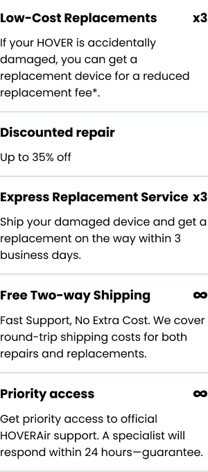 We provide a 12-month warranty on the flying camera device and most accessories. The battery is covered for 12 months or 100 cycles, whichever comes first, and the handlebar mount has a 6-month warranty. Please note that the warranty does not cover damage from user error, unauthorized repairs, or disassembly. Our official services include technical support, repairs, replacements, and other assistance you may need. *EU customers receive a 2-year warranty as mandated by consumer laws.